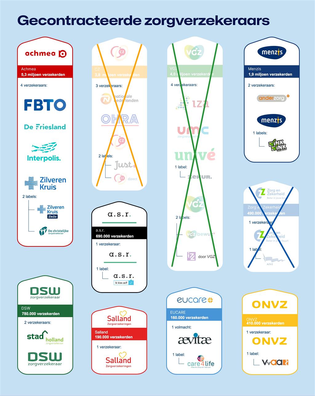 Wist u dat er meer dan 40 zorgverzekeraars zijn, maar dat zij onderdeel uitmaken van slechts 10 verzekeringsmaatschappijen? Hieronder een duidelijk overzicht.